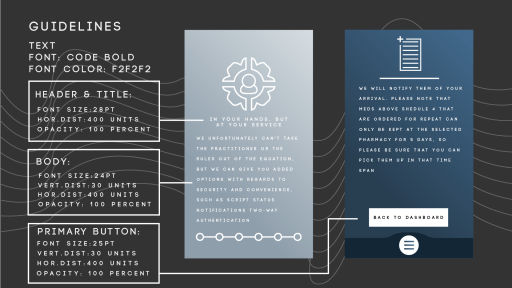 So we had a relatively short window of time to develop the guidelines for our app, but I finally got through it. I utilised only one font for the entire app, just with subtle alterations the kerning, font size, vertical distribution, opacity, etc, etc.