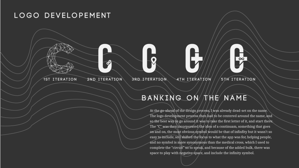Continuing that train of thought, what about the modern day pill? Aside from its obvious representative connection to the field of medicine and getting well, it has incredible symmetry and can be illustrated simply, So I experimented with further with the pill idea, 11 iterations but none of them really stuck. With a little help on my 9th iteration, I got to make some changes, and this is what I have now and have stuck with. It’s clean and simple, which suits the overall style.
