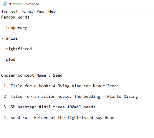 So we had consults today and were given another exercise, I’ll start with the exercise first. So the goal was to use a random word generator, and combine each word generated with the concepts we generated in the initial brainstorm process. So here are the Random Generated Words.