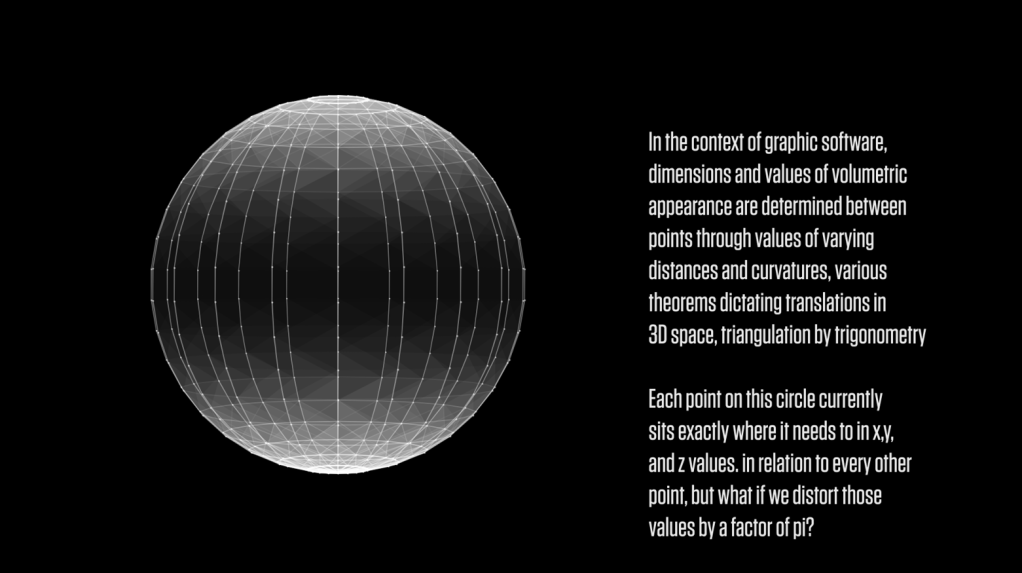 I’ve had to uninstall and reinstall some of my Adobe programs, some I couldn’t get to start up for some reason and others would cause severe ram usage spikes that would slow down my pc to an absolute crawl. This puts me a bit behind on the timeline of things, but I now have a direction significant enough to go on. I know that I have a certain strength when it comes to abstract motion graphics, so I will be applying what I know there. More details to come, but for now, I will be focusing on what was discussed in my first consult, initially, my first idea was to create everything using a plugin called plexus, because it defines everything in values of points and translates everything within expressions of triangulation which makes it extremely versatile, but I was told that it is extremely limiting to the brief to use only one plugin, so I will definitely be looking for more that have similar potential for use of generating unique outcomes with numbers. I was asked, what would some of these creative expressions of re-contextualized numbers look like and how would I make them work? Short answer is, I don’t know, and that is the beauty about it, the outcome is completely unknowable until the experiment is done. The thought process comes in about where to plug in the numbers and not what results from it. But for the purpose of giving you an idea of where I am going with this, here was a re-contextualization of pi as discussed within consult.
