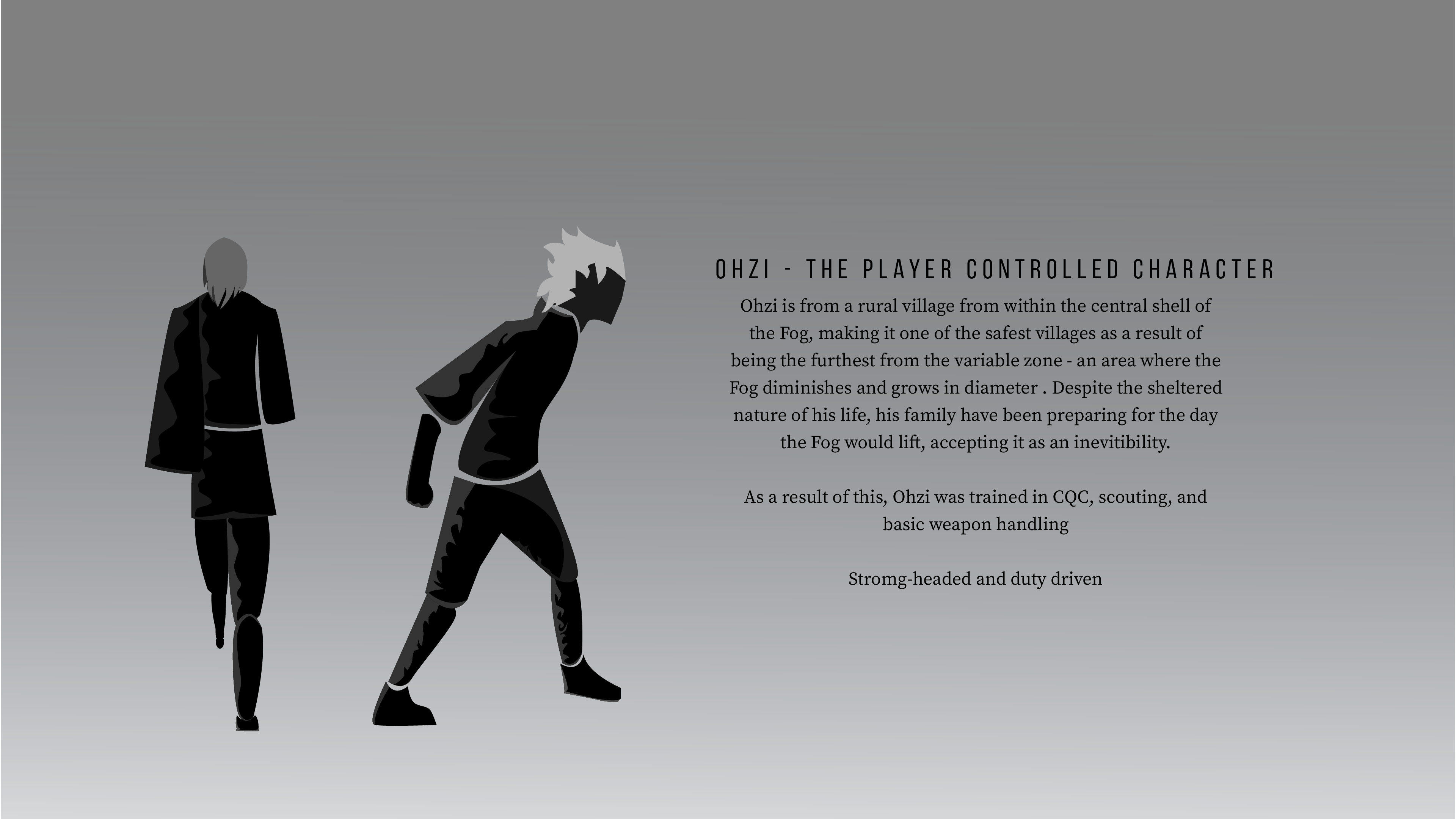Now, with these things in mind, we can create a profile on which to build (this is moving into the silhouette stage, but it is important to note that I intend on keeping all characters in a silhouette form). I think this is a step in the right direction. Following on with David Kegg’s tutorial, he goes on to talk about lighting and color. Strictly speaking, all characters in this world will be shades of black and grey due to the overall exposure to dull light as a result of the Fog.