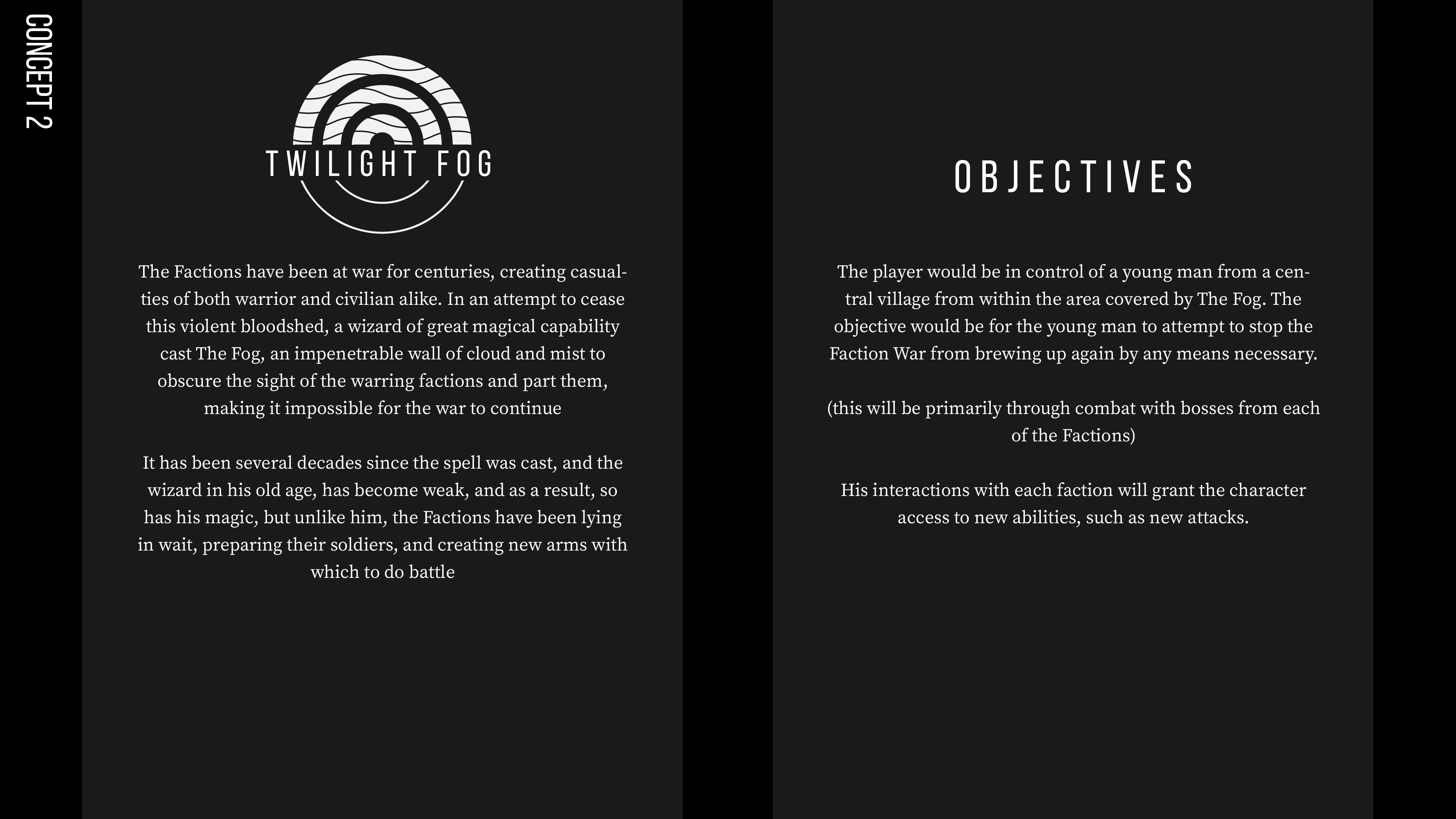 I managed to get as far as the splash screen for this concept, but then I ran into the issue of having to find a style with which the characters and assets would suit the concept. I am no illustrator, and ultimately, I also have to keep in mind that I need to code the systems of the game in the end, which is all new to me, If I want to make a decent game, I’m gonna have to spend more time learning , I can’t be spending so much time illustrating. From this point, I just moved straight into concept 2, which I think is more plausible of a project given the time-frame we’re given.