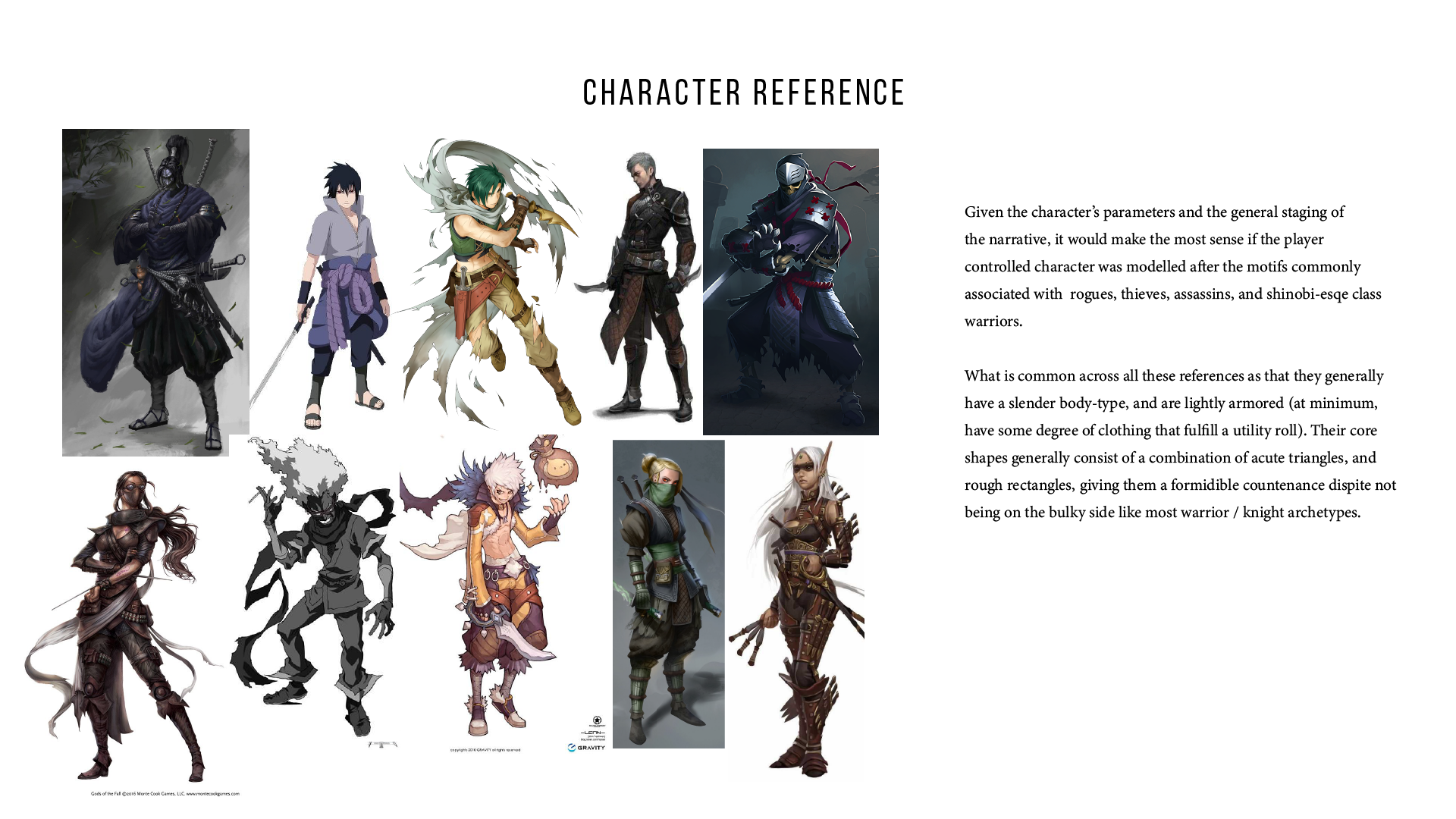My parameters were somewhat already set by the first time I attempted to make a character. I then moved to an actual reference sheet, selecting images based on my idea of what kind of warrior type would best suit the narrative of the player-controlled character. We already know that the character is of a relatively young age, is cqc orientated with scout and intelligence gathering training, to be effective at those roles, he would have to be fast, both in a distance-covering sense, in a situational awareness sense, and a combat-orientated sense.