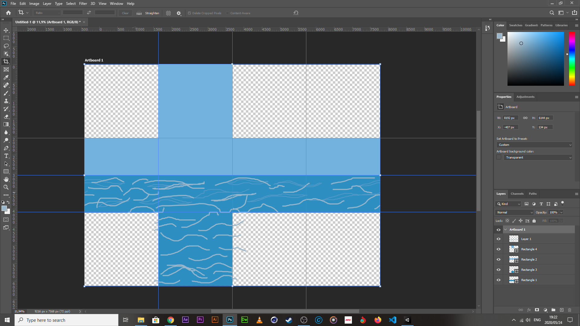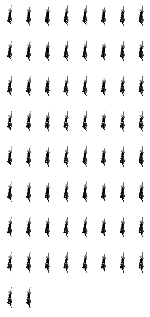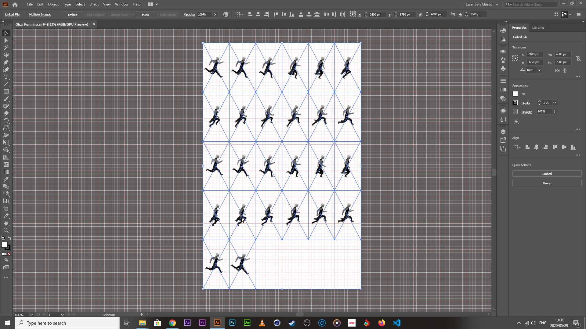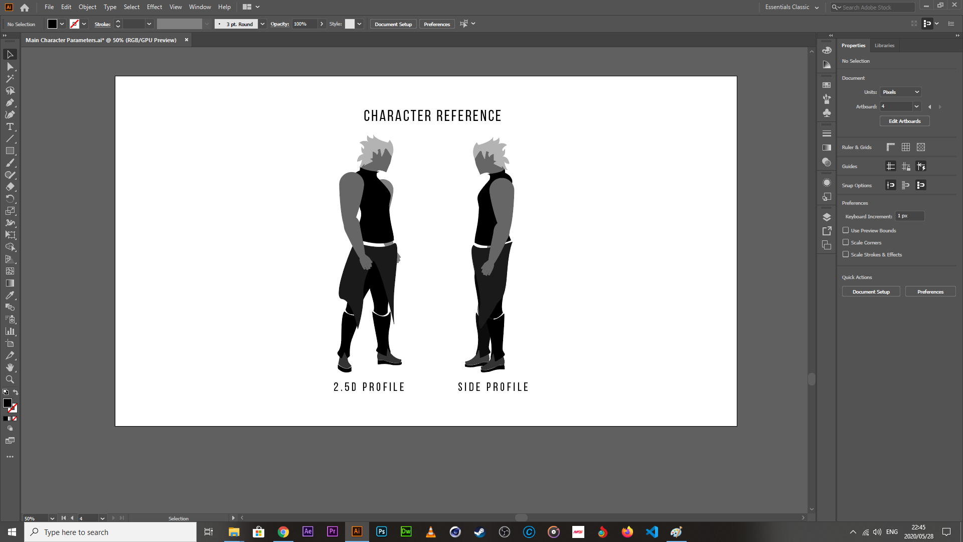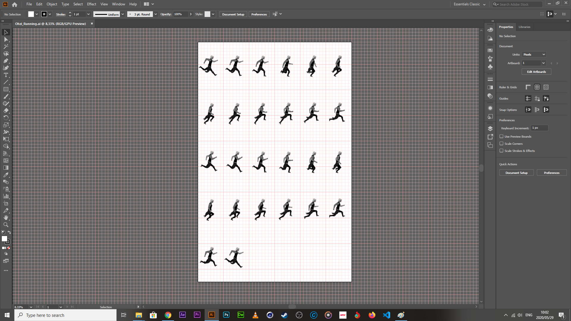 What it boils down to, is the creation of a grid to the same specs of each of the images (obviously, the specs have to be unified across the board for all of the images in the sheet). To make the grid, I needed to ensure that I was granting the minimum amount of space necessary to each frame, while ensuring that they have enough space for any secondary actions to be added at a later date. To do this, I created another composition in each of the rig files, set the width/height to 800 X 1500px each (I already knew that my profiles were centered to the middle of the artboard originally and afx makes changes of the composition size from the center, so I didn’t have to do any additional math when throwing in the animations into the new comps). Then, it was a matter of exporting them, and then putting them into an illustrator file that had a width that was a multiple of 800px and a height of 1500px; this ensures that when I set the grid options to the image size, they lock to the artboard perfectly, and should I make a mistake, it will be visible immediately. This is what the grid system looks like.