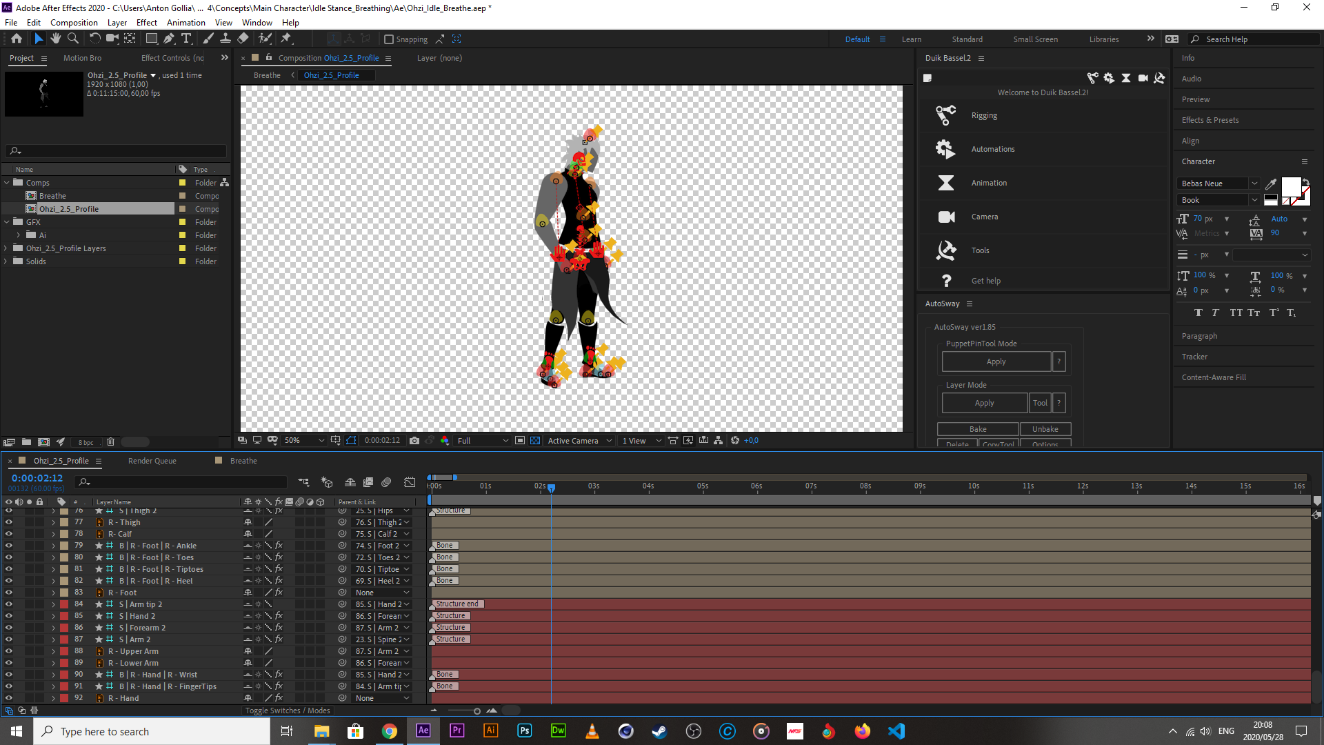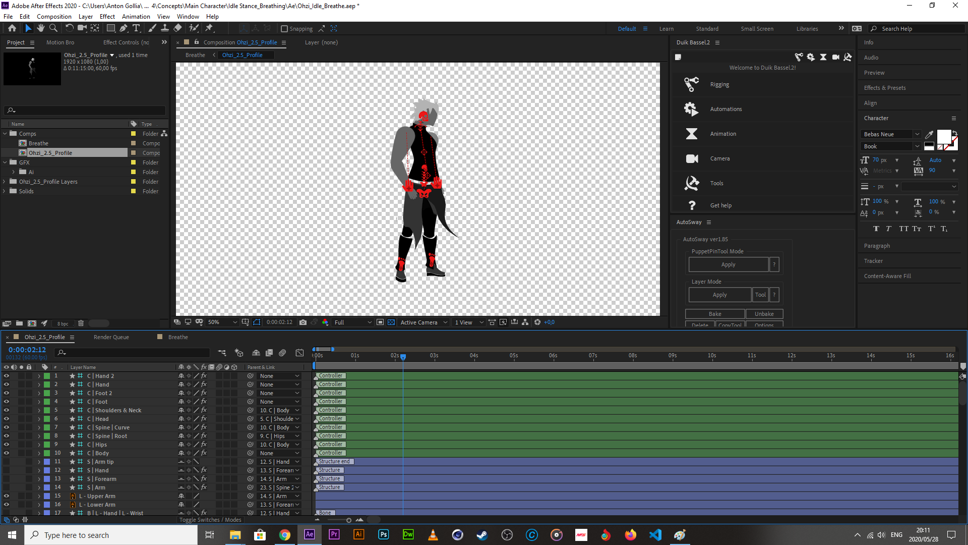 I went on to create the idle first, seeing as it would be the simplest thing to animate at this point. The breathing was fine on its own but it seemed a bit boring, so I created some minor cloth waving through the use of puppet pins, and a plugin called Autosway. My character feels combat ready already, someone cue the epic battle music.