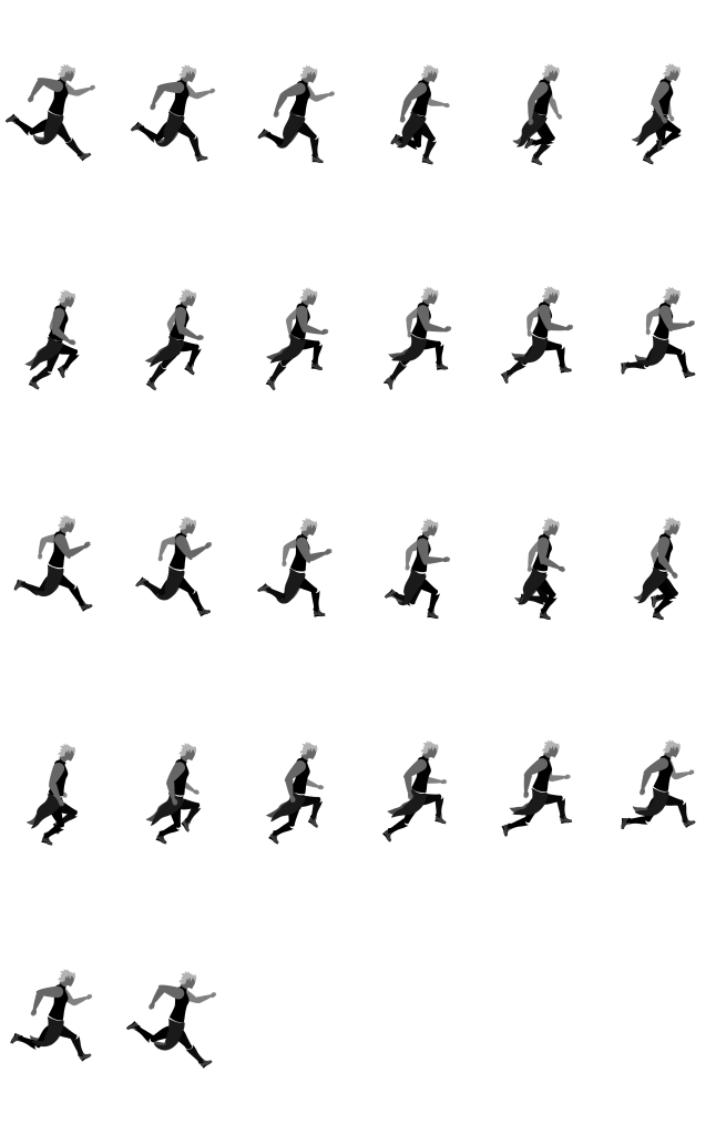 The next step was to move on to the other primary animations, running and jumping. I followed the same steps as above and rig the side-profile and animate them. Everything was going pretty well throughout, but I did run into another snag near the end of the animation process for all three of these. If you take a closer look at my previous images of me in the rigging process, you’d realise that I was working in 1920 X 1080px. At the end of this, I need to be able to bring all of these into a photoshop or illustrator file to create a spritesheet composition. Of course, I didn’t know enough to do this, so I watched a video on the ins and outs.