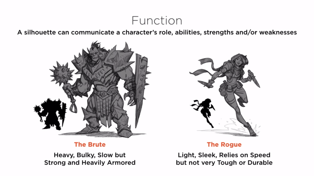 As stated above, the silhouette speaks of the potential role or function of a character and what traits they rely on. Again, there is the potential for characters to exude abilities and qualities outside of their form (which is often done to shake people out of pre-conceived notions of “what you see is what you get.” It can also be worked into game systems where the premise allows for breaks in traditional senses of physics, like magic systems), but the norm is for the function to meet the form.