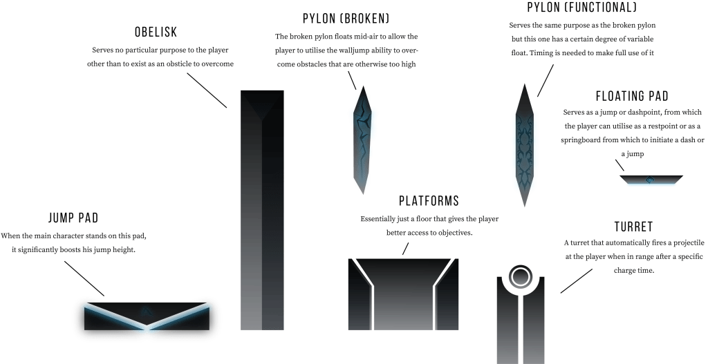 Now there are other things to consider. The way the map is designed needs to be reconsidered, as the nature of the game itself is different to what was initially conceptualized. Naturally creating a game centered around traversal as its primary challenge, is there even really a need for enemies? Would it make sense to put enemies in a game where the challenge is derived from executing and timing predictable routes around obstacles? I have been thinking about this for a while, and it doesn’t make sense to put enemies to defend a position that is already hostile to the player, nor does it make sense to the backstory, but what if the enemies were already fixed in the environment?