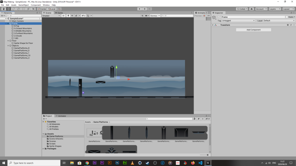 - The floor sprite has been turned into a Sprite Shape for easy access and creation between multiple scenes
