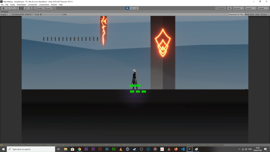 - Death and Respawn needs to worked out. I could easily just destroy the game object and use the particle system to create a burst or something, but it wouldn’t really do it justice (if there’s time and I come across a method to include an animation, I will build one).