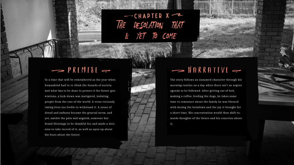 The premise: In a time that will be remembered as the year when humankind had to re-think the bounds of society and what has to be done to protect it for future generations, a lock-down was instigated, isolating people from the rest of the world. The virus viciously taking lives too feeble to withstand it. A sense of dread and sadness became the general norm, and yet, amidst the pain and anguish, someone has found blessings to be thankful for, and made a decision to take record of it, as well as open up about his fears about the future.